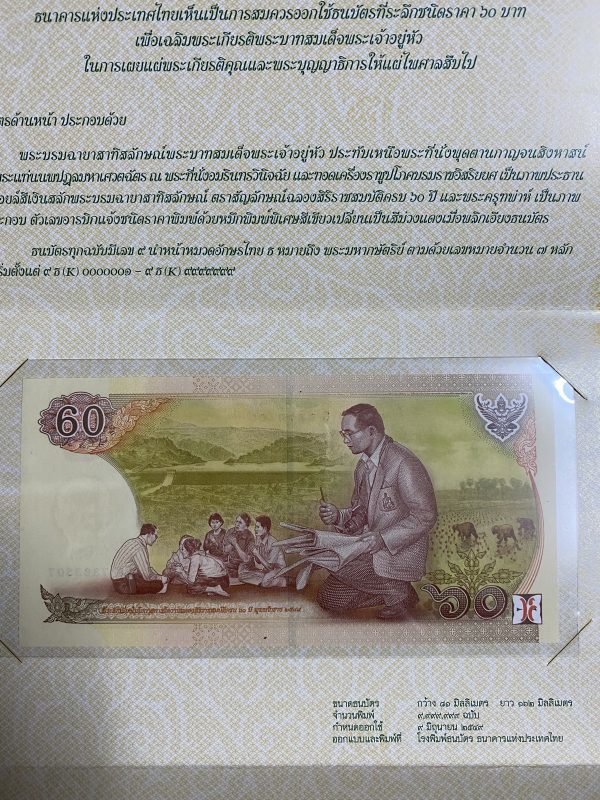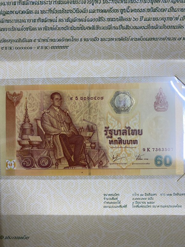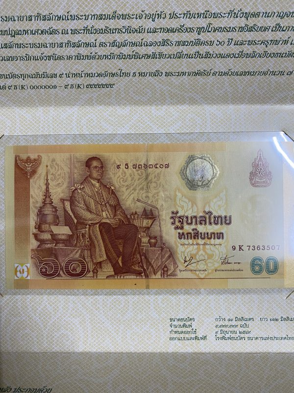 พิมพ์โรงพิมพ์ธนบัตรไทย ออกใช้ 9 มิถุนายน 2549 หมวด 9 ธ 7363507 ( 9,999,999 ฉบับ ) ฉบับ 60 บาท
