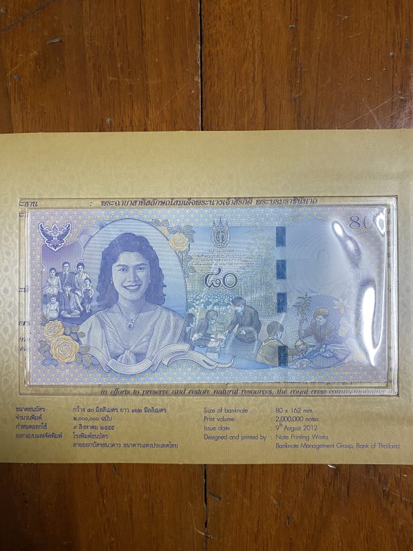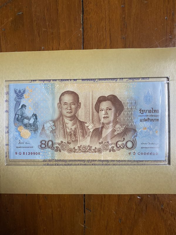พิมพ์โรงพิมพ์ธนบัตรไทย ออกใช้ 9 ธันวาคม 2555 หมวด 9 Q 8139906 ( 2,000,000 ฉบับ ) ฉบับ 80 บาท