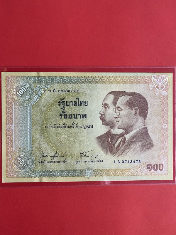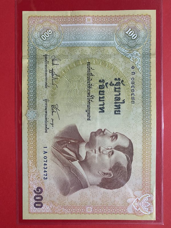 ธนบัตรแบบ 9 100 บาท รุ่นที่ 5 ประกาศใช้ 27 สิงหาคม 2501 ลายเซ็น ส. วินิจฉัยกุล - ป๋วย อึ๊งภากรณ์ พิมพ์ บริษัท โทมัส เดอ ลา ลู