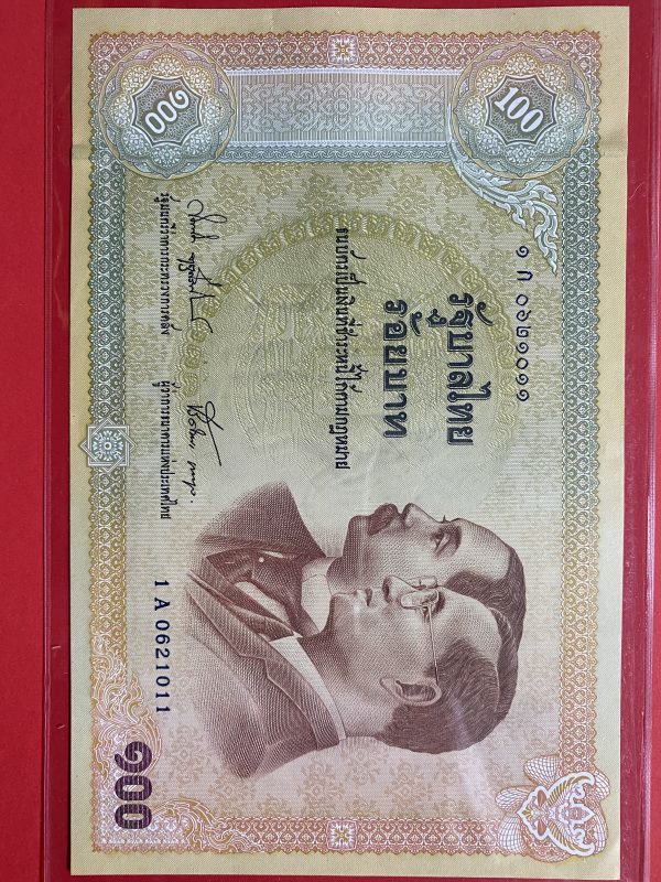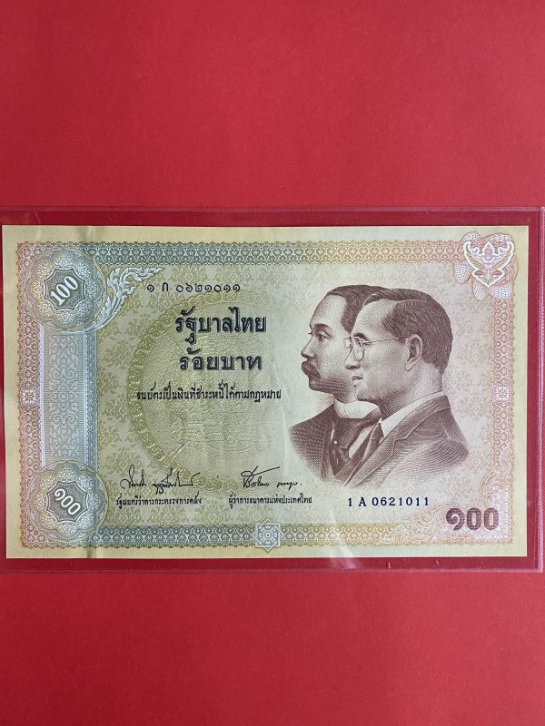 ธนบัตรแบบ 9 100 บาท รุ่นที่ 5 ประกาศใช้ 27 สิงหาคม 2501 ลายเซ็น ส. วินิจฉัยกุล - ป๋วย อึ๊งภากรณ์ พิมพ์ บริษัท โทมัส เดอ ลา ลู