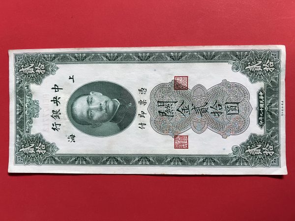 ธนบัตรเก่าประเทศจีน ค.ศ. 1930 มูลค่า 20 YUAN อายุประมาณ 80 กว่าปี สภาพใช้