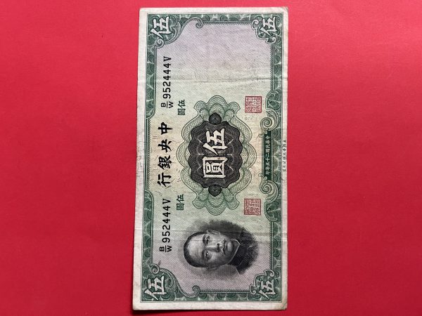 ธนบัตรเก่าประเทศจีน ค.ศ. 1936 มูลค่า 5 YUAN อายุประมาณ 80 กว่าปี สภาพใช้