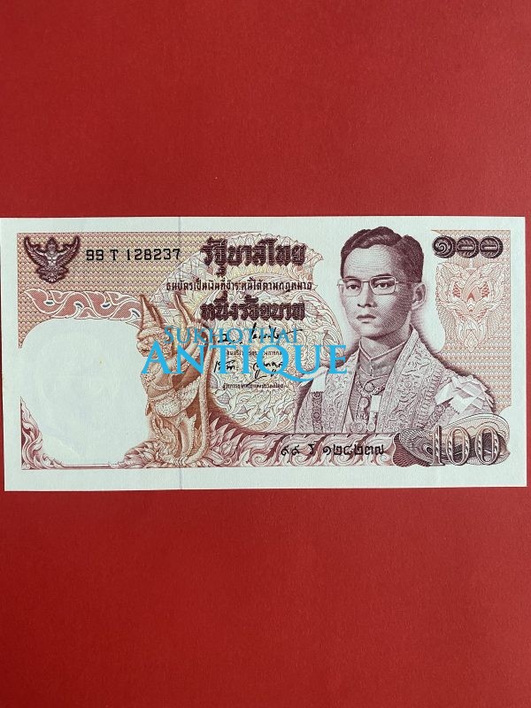 ธนบัตรแบบ 9 100 บาท รุ่นที่ 5 ประกาศใช้ 27 สิงหาคม 2501 ลายเซ็น ส. วินิจฉัยกุล - ป๋วย อึ๊งภากรณ์ พิมพ์ บริษัท โทมัส เดอ ลา ลู