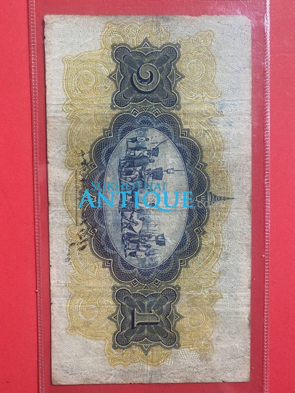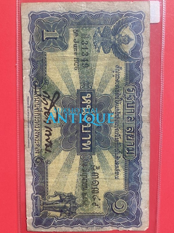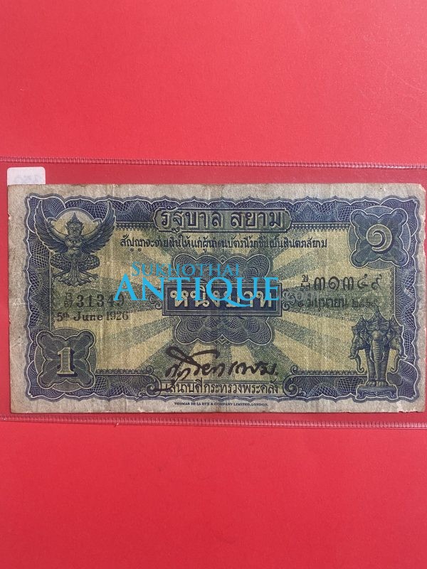 ธนบัตรแบบ 2 ไถนา1บาท รุ่นที่ 1 ประกาศใช้ 21 กรกฎาคม 2468 ลายเซ็น ศุภโยคเกษม พิมพ์ที่ บริษัท โทมัส เดอ ลา รู แอนด์ คัมปานี