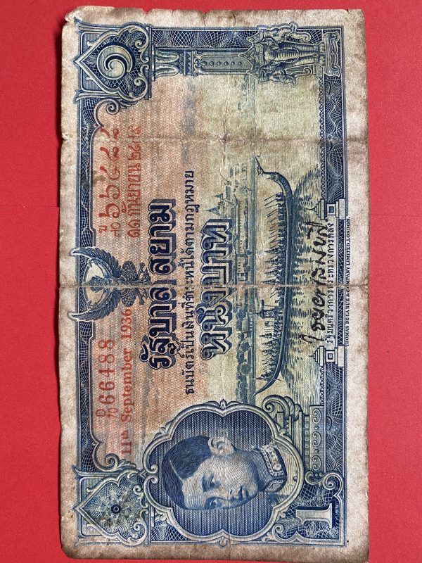 ธนบัตรแบบ 3 1บาท รุ่นที่ 2 รัชกาลที่ 8 ประกาศใช้ 28 กันยายน 2479 ลายเซ็น พระยาไชยศสมบัตร พิมพ์ที่ บริษัท โทมัส เดอ ลา รู