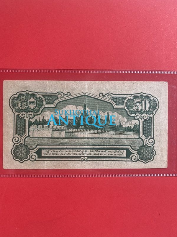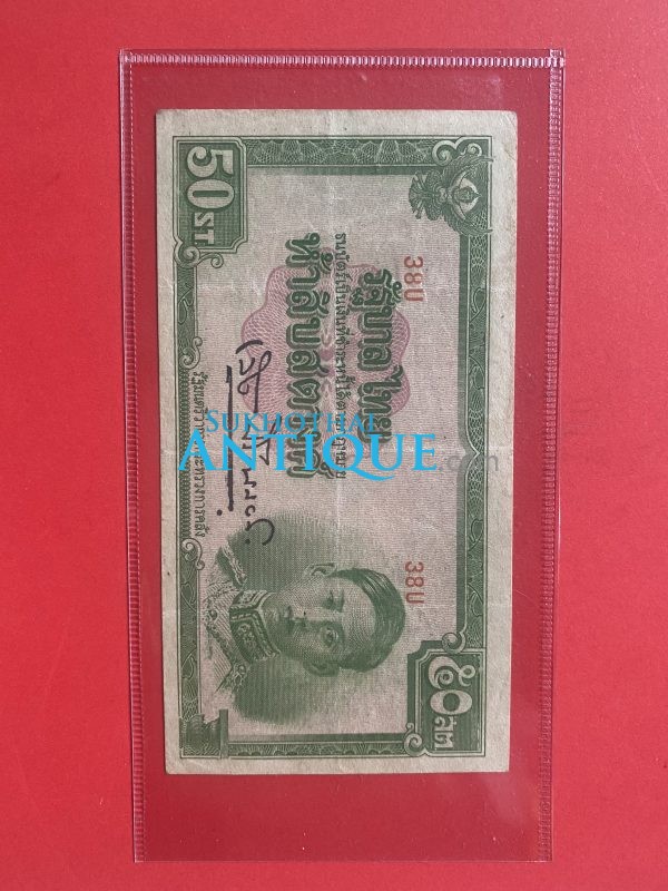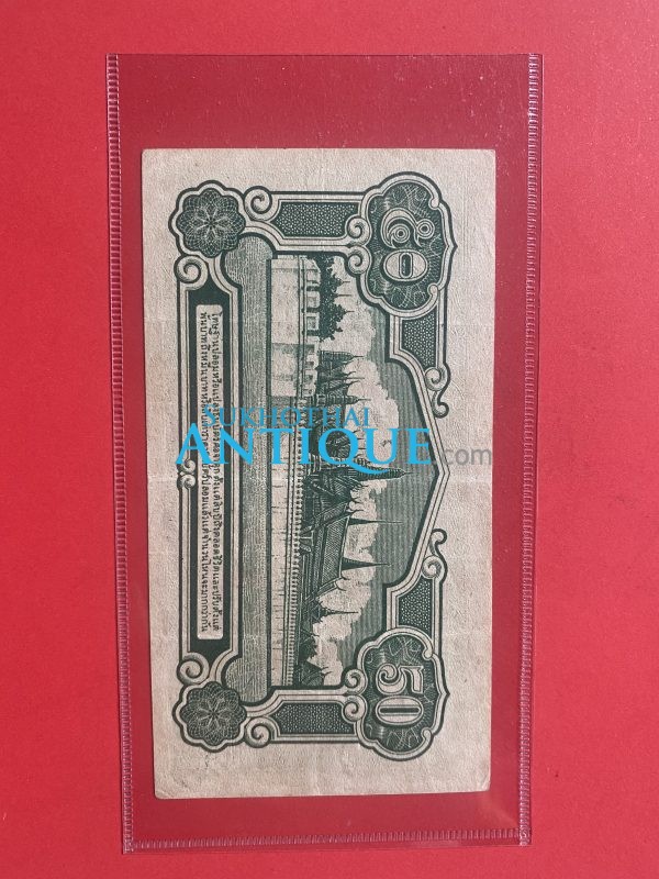 ธนบัตรแบบ 5 50 สตางค์ รุ่นที่ 1 ร.8 ประกาศใช้ 16 เม.ย. 2485 ลายเซ็น เล้ง ศรืสมวงศ์ พิมพ์ที่โรงพิมพ์ธนบัตร กระทรวงการคลังญี่ปุ่น