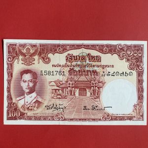 ธนบัตรแบบ 9 100 บาท รุ่นที่ 5 ประกาศใช้ 27 สิงหาคม 2501 ลายเซ็น ส. วินิจฉัยกุล - ป๋วย อึ๊งภากรณ์ พิมพ์ บริษัท โทมัส เดอ ลา ลู
