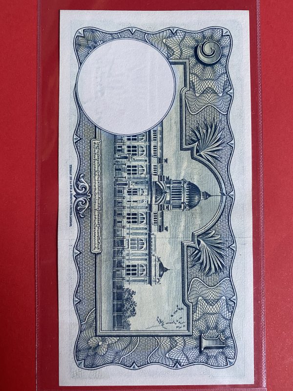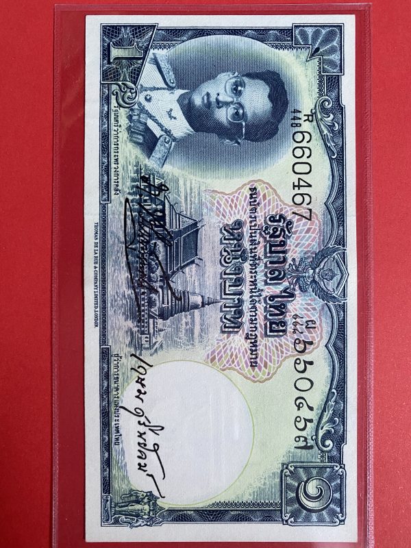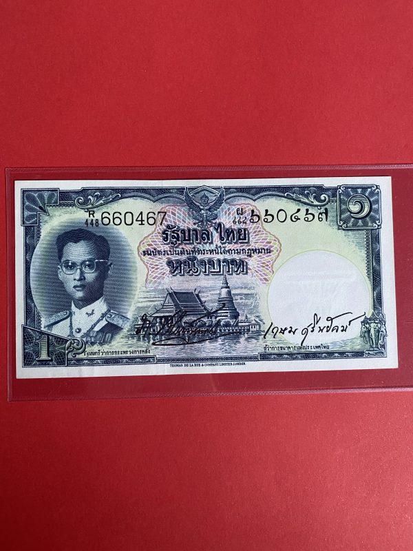 ธนบัตรแบบ 9 1บาท รุ่นที่ 4 ประกาศใช้ 10 มกราคม 2498 ลายเซ็น ภ บริภัณฑ์ยุทธกิจ - เกษม ศรีพยัคฆ์ พิมพ์ที่ บริษัท โทมัส เดอ ลา