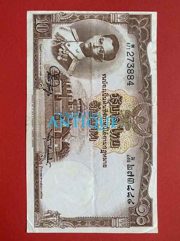 ธนบัตรแบบ 9 10บาท รุ่นที่ 6 ประกาศใช้ 27 สิงหาคม 2501 ลายเซ็น สมหมาย ฮุนตระกูล – พิสุทธิ์ นิมมานเหมินท์ พิมพ์ที่ บริษัท โทมัส