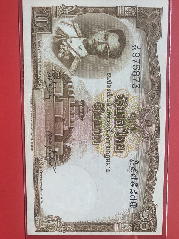 ธนบัตรแบบ 9 10 บาท รุ่นที่ 5 ประกาศใช้ 27 มิถุนายน 2500 ลายเซ็น ส.วินิจฉัยกุล – เกษม ศรีพยัคฆ์ พิมพ์ที่ บริษัท โทมัส เดอ ลา รู
