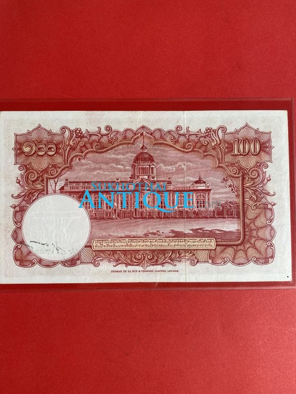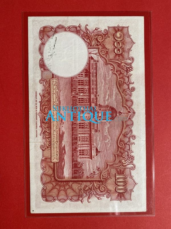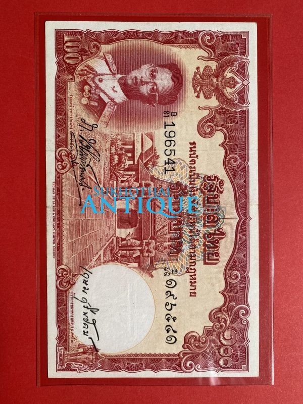 ธนบัตรแบบ 9 100 บาท รุ่นที่ 5 ประกาศใช้ 27 สิงหาคม 2501 ลายเซ็น ส. วินิจฉัยกุล - ป๋วย อึ๊งภากรณ์ พิมพ์ บริษัท โทมัส เดอ ลา ลู