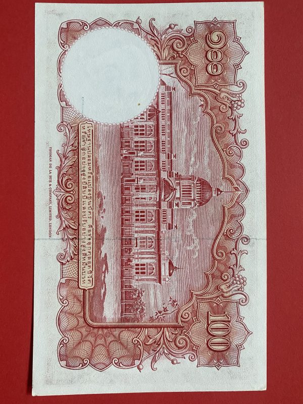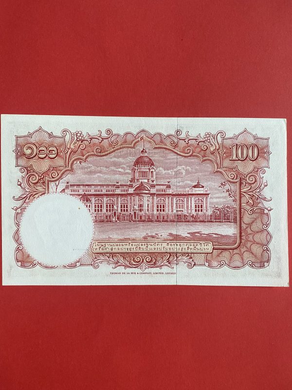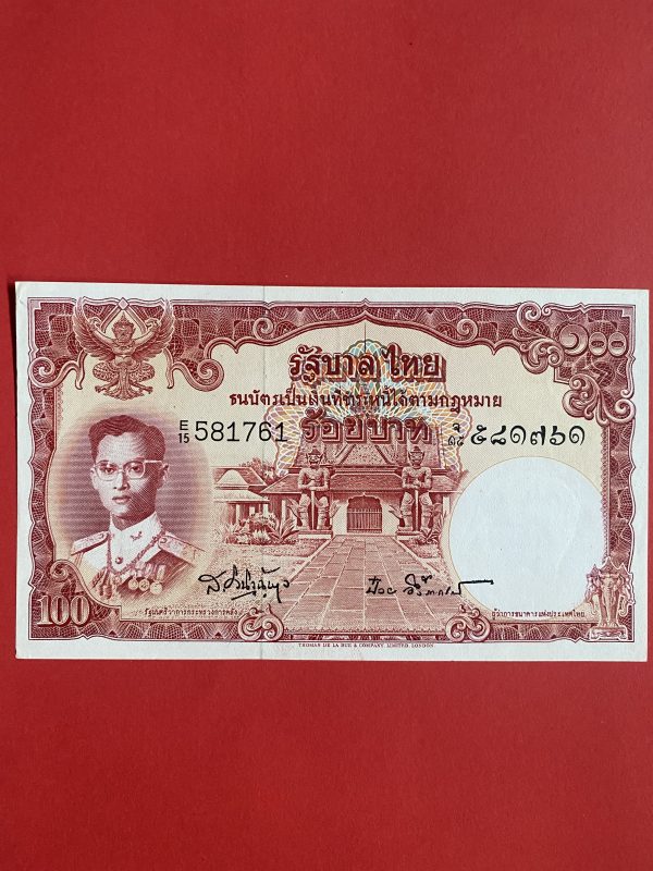 ธนบัตรแบบ 9 100 บาท รุ่นที่ 5 ประกาศใช้ 27 สิงหาคม 2501 ลายเซ็น ส. วินิจฉัยกุล – ป๋วย อึ๊งภากรณ์ พิมพ์ บริษัท โทมัส เดอ ลา ลู