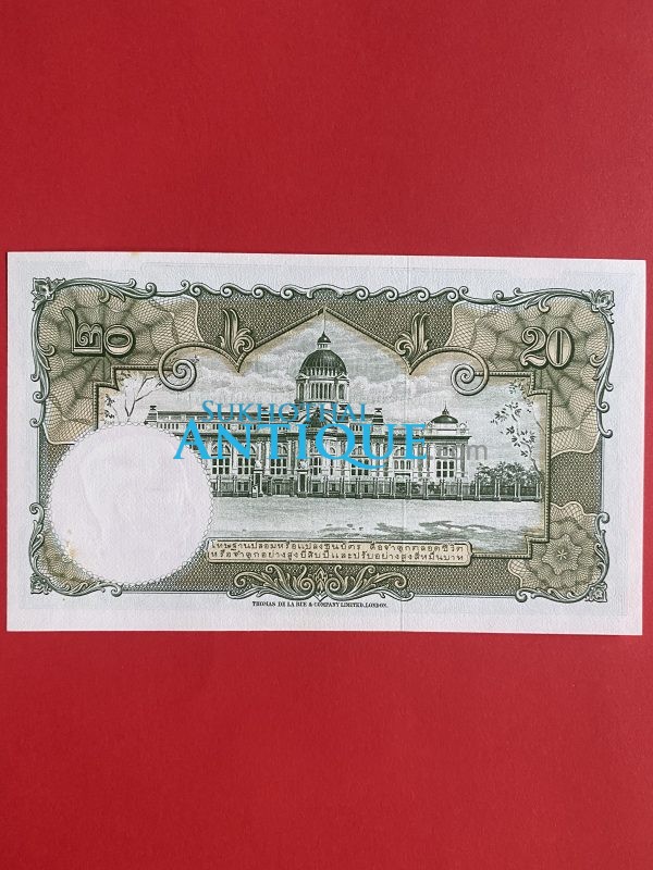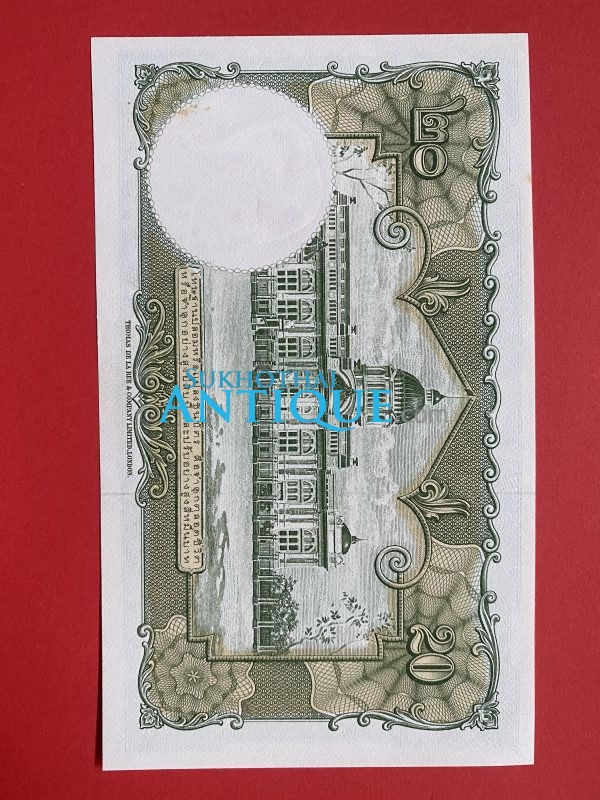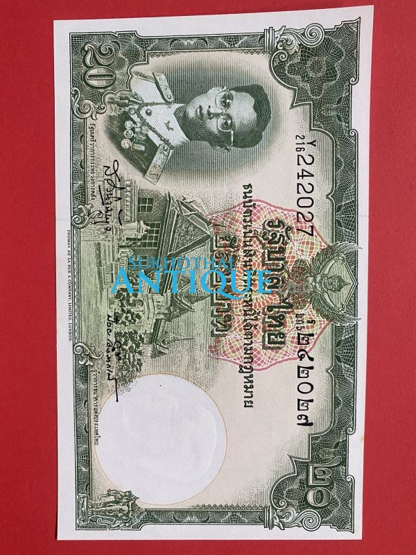 ธนบัตรแบบ 9 20 บาท รุ่นที่ 6 ประกาศใช้ 27 สิงหาคม 2501 ลายเซ็น ส.วินิจฉัยกุล – ป๋วย อึ๊งภากรณ์ พิมพ์ บริษัท โทมัส เดอ ลา ลู