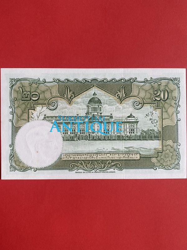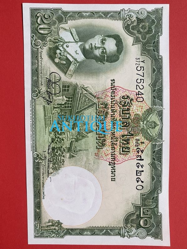 ธนบัตรแบบ 9 20 บาท รุ่นที่ 6 ประกาศใช้ 27 สิงหาคม 2501 ลายเซ็น สมหมาย ฮุนตระกูล – พิสุทธ์ นิมมานเหมินท์ พิมพ์ บริษัท โทมัส เดอ