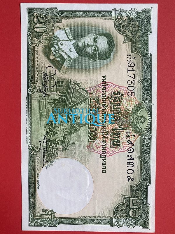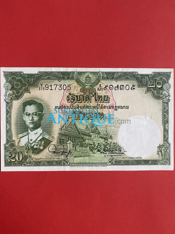 ธนบัตรแบบ 9 20 บาท รุ่นที่ 6 ประกาศใช้ 27 สิงหาคม 2501 ลายเซ็น สมหมาย ฮุนตระกูล – พิสุทธ์ นิมมานเหมินท์ พิมพ์ บริษัท โทมัส เดอ