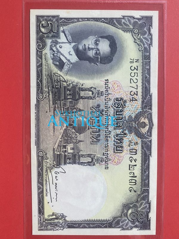 ธนบัตรแบบ 9 1บาท รุ่นที่ 4 ประกาศใช้ 10 มกราคม 2498 ลายเซ็น ภ บริภัณฑ์ยุทธกิจ - เกษม ศรีพยัคฆ์ พิมพ์ที่ บริษัท โทมัส เดอ ลา