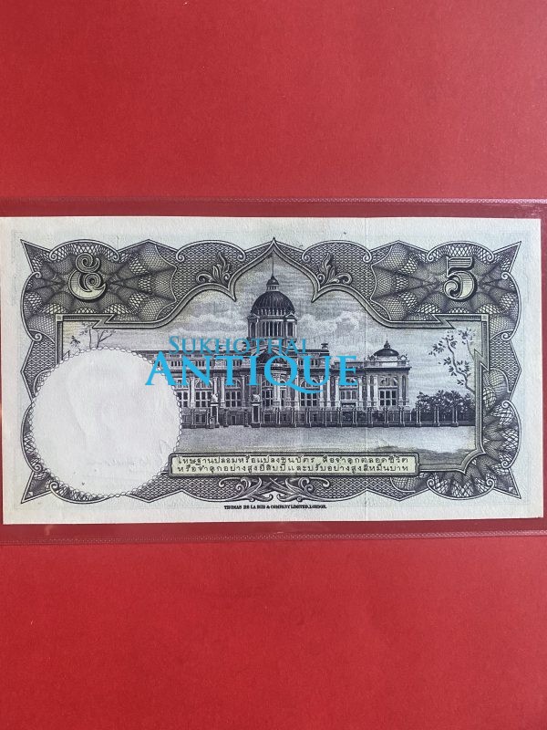 ธนบัตรแบบ 9 5บาท รุ่นที่ 6 ประกาศใช้ 27 สิงหาคม 2501 ลายเซ็น โชติ คุณะเกษม – โชติ คุณะเกษม พิมพ์ที่ บริษัท โทมัส เดอ ลา รู