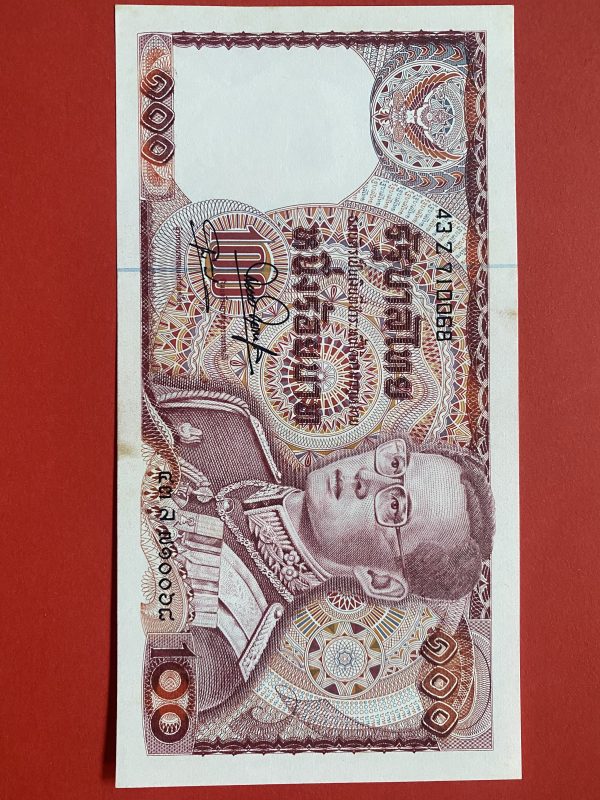 ธนบัตรแบบ12 100 บาท รุ่นที่ 1 ต่างจากรุ่นที่ 2 คือมี 6 หลัก ลายเซ็น สมหมาย ฮุ่นตระกูล – กำจร สถิรกุล พิมพ์โรงพิมพ์ธนบัตรของไทย