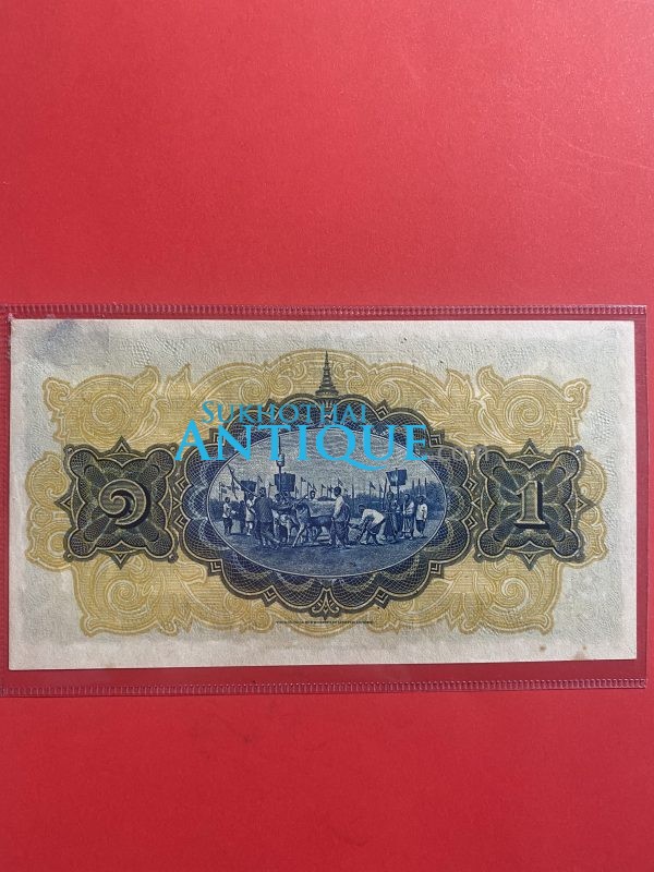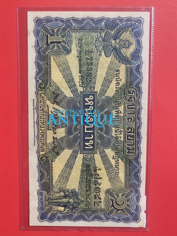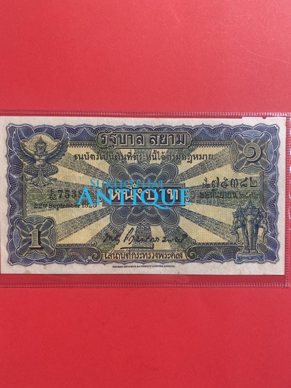 ธนบัตร แบบ 2 ไถนา1บาท รุ่นที่ 2 ประกาศใช้ 19 กุมภาพันธ์ 2471 ลายเซ็น พระยาโกมารกุลมนตรี พิมพ์ที่ บริษัท โทมัส เดอ ลา รู แอนด์