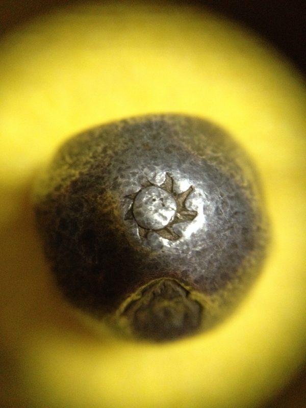 พดด้วงเม็ด 1 บาทสมัยพระเจ้าปราสาททองปี พ.ศ. 2173-2198 ตรา พุ่มข้าวบิณฑ์จอมปราสาท เป็นรูป 7 จุดอยู่ภายในกรอบ สวยคมชัดมากๆ (เม็ดที่ 2)