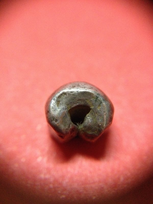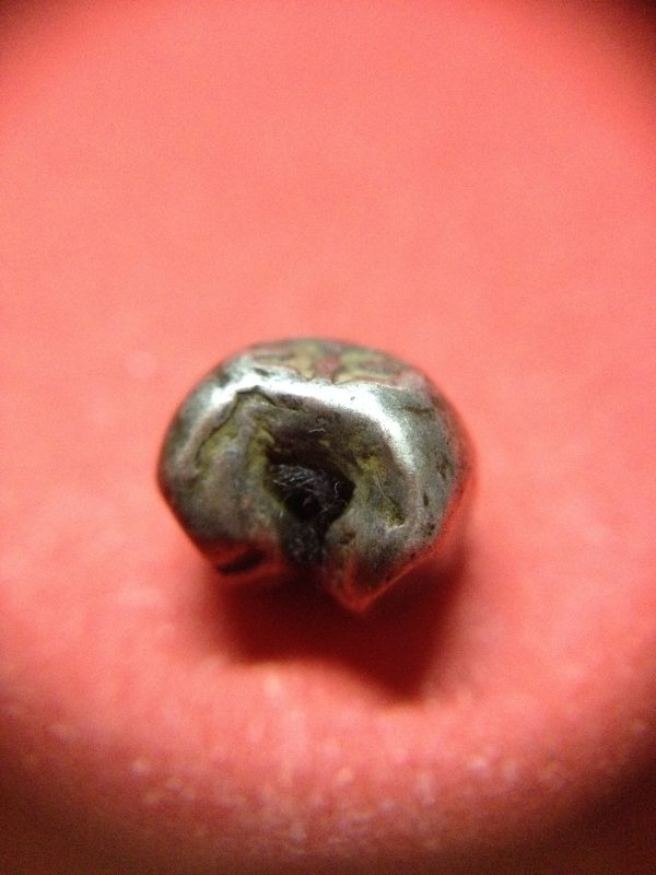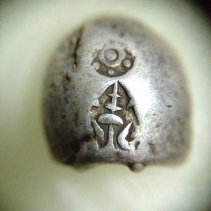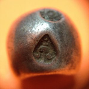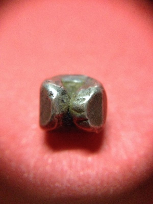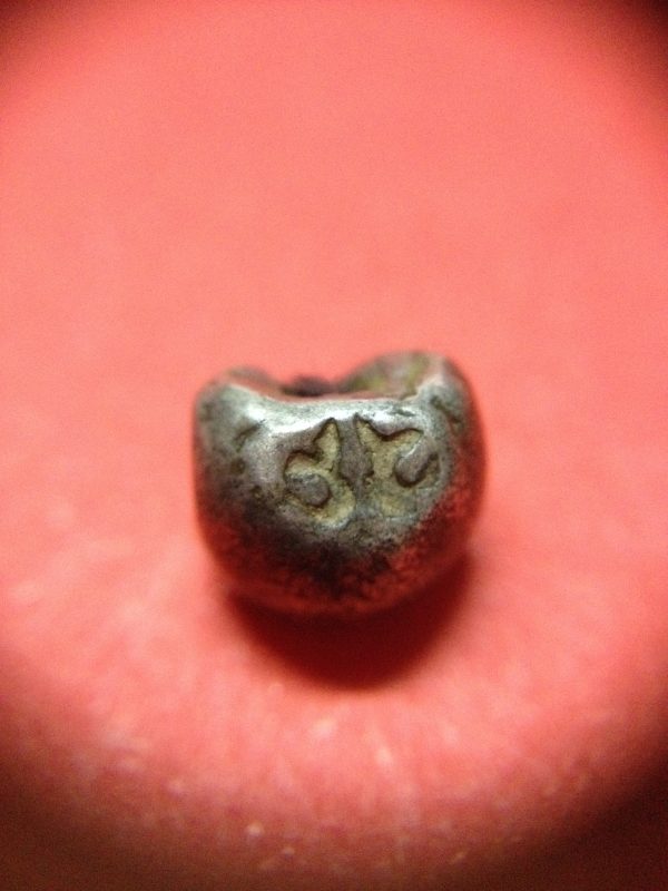 พดด้วงเม็ดเฟื้อง ตราดอกไม้คล้ายหัวลูกศรหันหัวลงมีจุดสามจุดที่ปลายศร สมัย ร.1 (ผลิตในงานพระราชพิธีสตสดก มหาทาน) เม็ดที่ 1