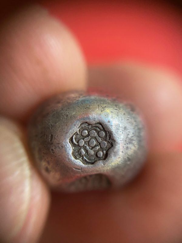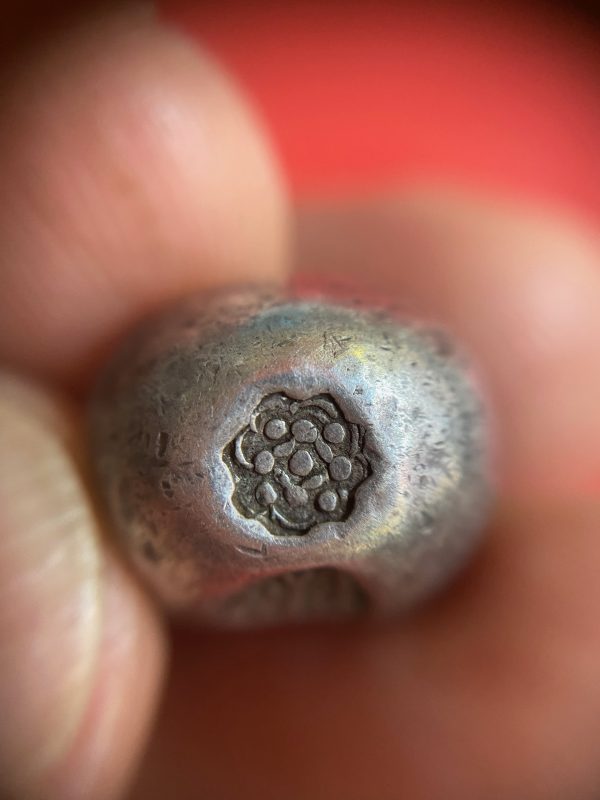 พดด้วงเม็ด 1 บาทสมัยพระเจ้าทรงธรรมปี พ.ศ. 2155-2171 ตรา เปลวเพลิง เป็นรูปคล้ายดวงไฟมีเปลวลอยสองข้าง สวยคมชัดมากๆหายากมากสภาพนี้ (เม็ดที่ 11)