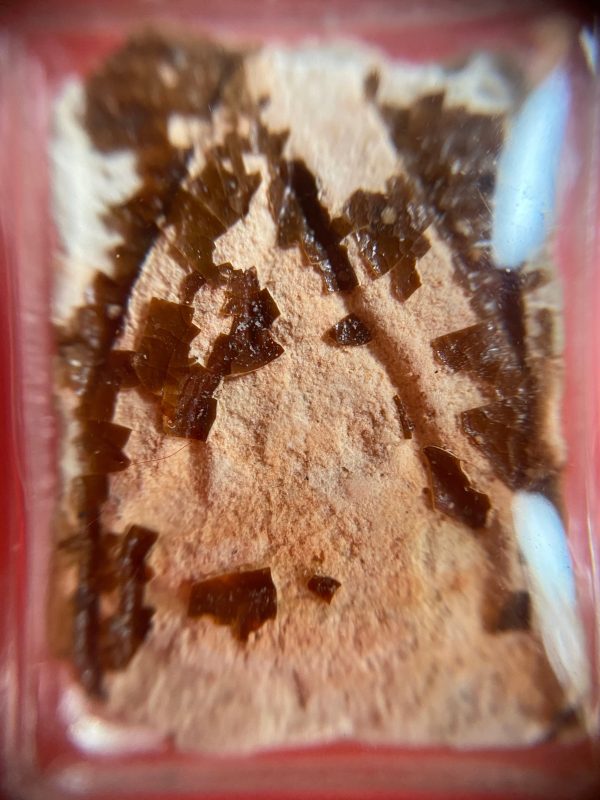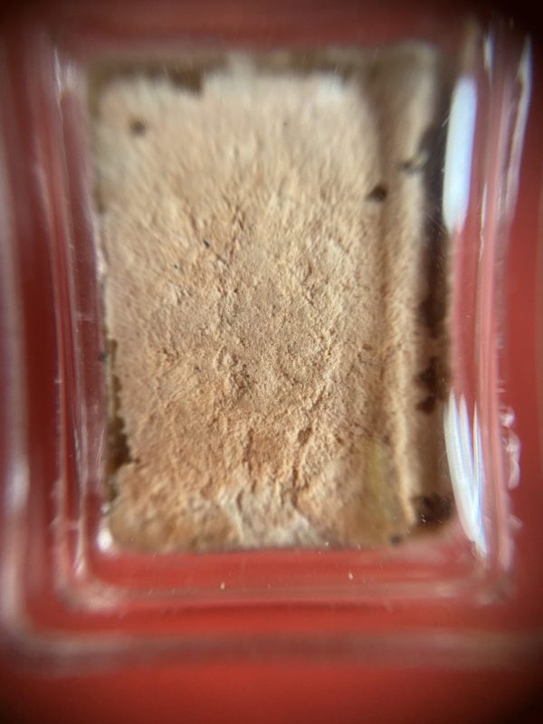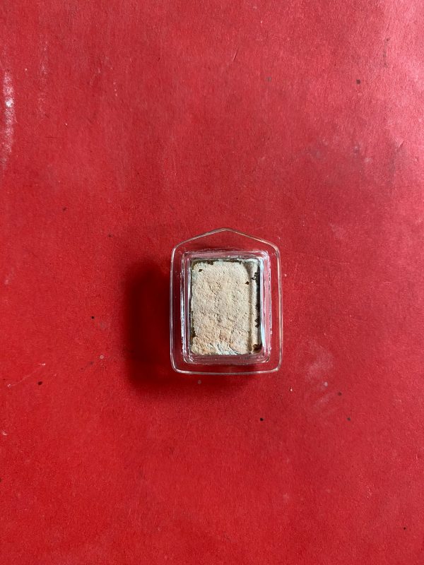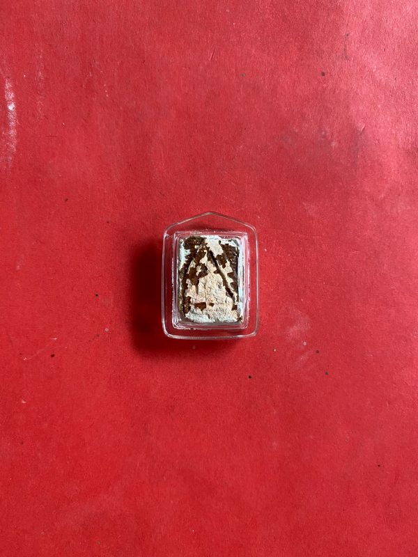 พระของขวัญปากนํ้ารุ่นแรกสร้างโดย “หลวงพ่อสด จัทสโร” เนื้อผงสีขาวนวลอมชมภู เคลือบเชอร์แลค เลี่ยมพลาสติก