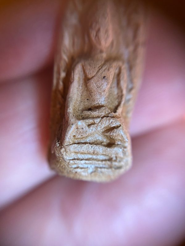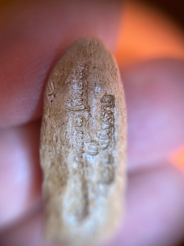 พระรอดเนื้อดินมีหน้าตา ด้านหลังมีปั้มบล็อกตัวหนังสือจม ไม่ทราบวัดและพิธี