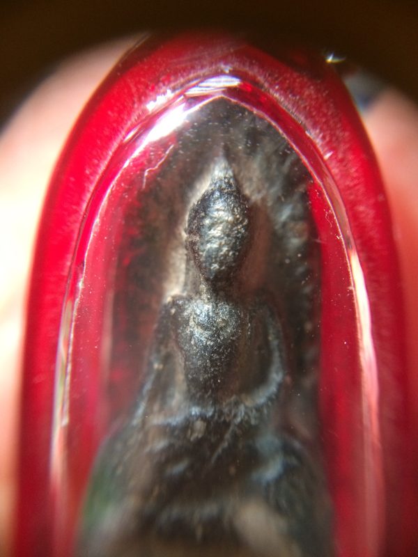 พระรอดเนื้อวานสีดำเก่า เลี่ยมอยู่ในกรอบพลาสติกกันนำ้ใสขอบสีแดง