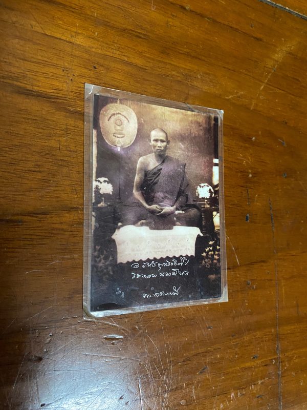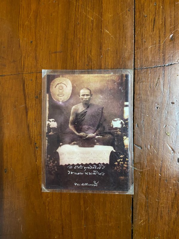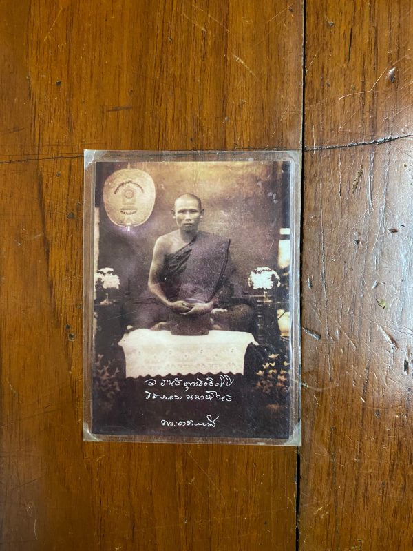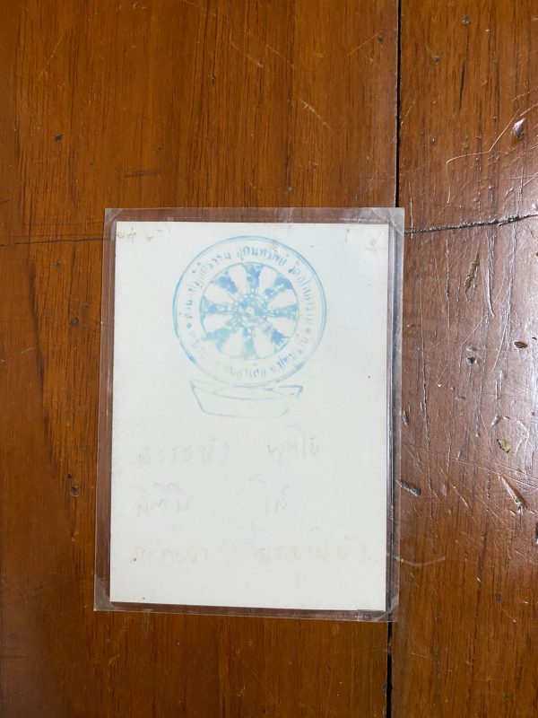 ภาพถ่ายเก่าพระอาจารย์ ลี ใบเล็กออกจากวัด ด้านหลังปั้มตรากรงจักรของวัดในหนองเสือ จ.ปทุมธานี