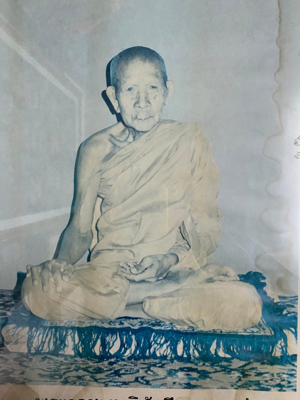 รูปถ่ายเก่าหลวงพ่อนุ้ย วัดคุ้งยาง อ.สวรรคโลก ด้านหลังเป็นภาพเจดีย์คมชัดสวยงาม เลี่ยมพลาสติกอยู่ในกรอบเงินแกะลายยกซุ้ม