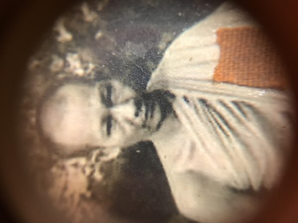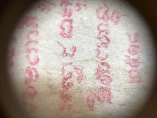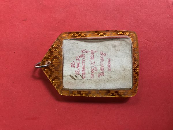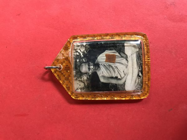 รูปถ่ายหลวงพ่อเกษม ปี 2518 กระดาษหนังไก่ ด้านหน้ามีจีวรที่องค์ท่าน ส่วนด้านหลังก็มียันต์สีแดงขนาดประมาณ 1″x2″