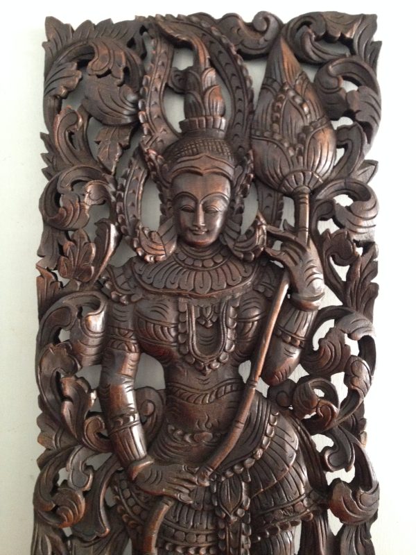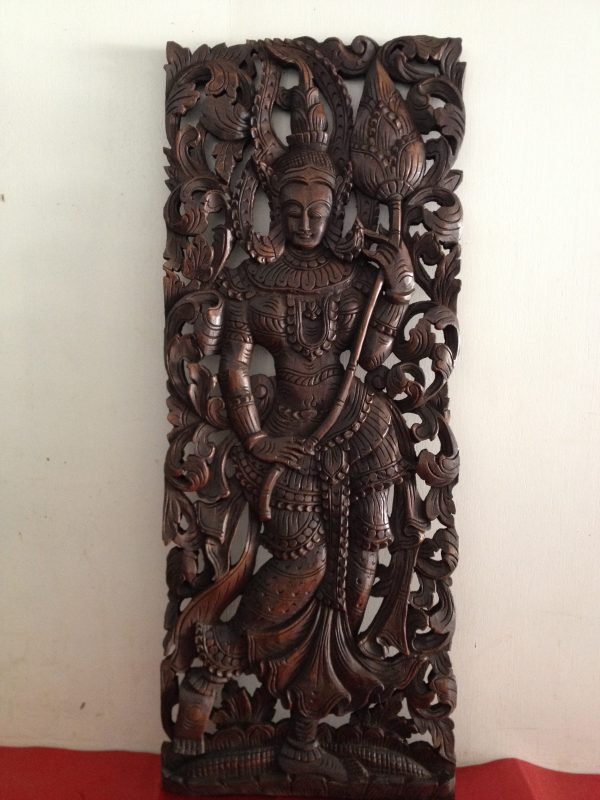 รูปนางฟ้ายืนถือดอกบัว แกะสลักสามมิติอ่อนช้อยบนไม้ขนุน ขนาด 14″x36″