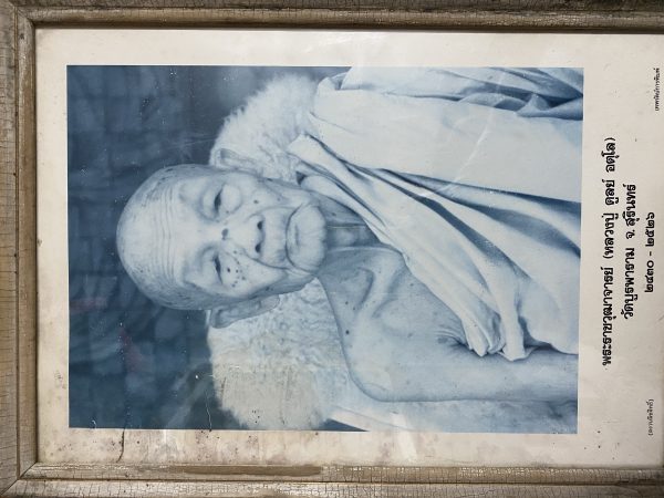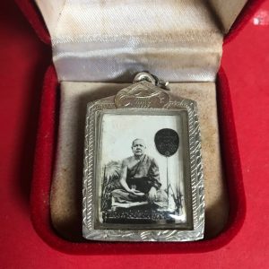รูปถ่ายเก่าหลวงพ่อนุ้ย วัดคุ้งยาง อ.สวรรคโลก ด้านหลังเป็นภาพเจดีย์คมชัดสวยงาม เลี่ยมพลาสติกอยู่ในกรอบเงินแกะลายยกซุ้ม