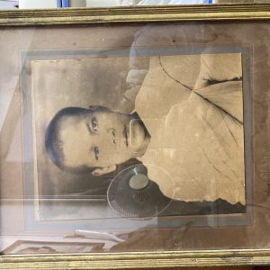 รูปวาดเสด็จพ่อ ร.5 แบบไรเงาด้วยดินสอเก่าบานใหญ่ เหนือรูป มีปั้มตราครุฑสีแดงเดิม และมีปิดทองไว้อยู่ด้านข้างและด้านล่าง