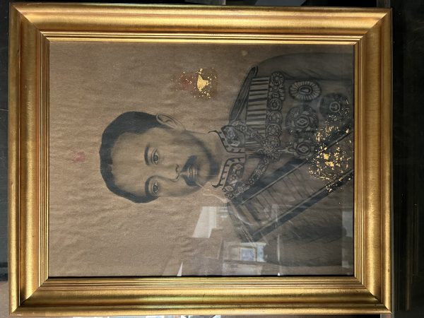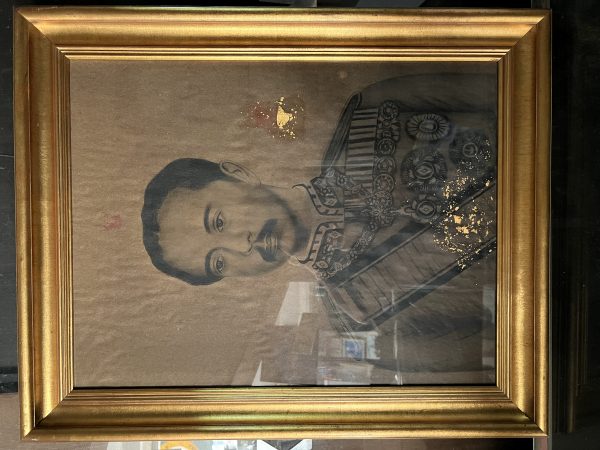 รูปวาดเสด็จพ่อ ร.5 แบบไรเงาด้วยดินสอเก่าบานใหญ่ เหนือรูป มีปั้มตราครุฑสีแดงเดิม และมีปิดทองไว้อยู่ด้านข้างและด้านล่าง