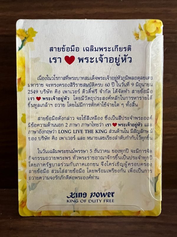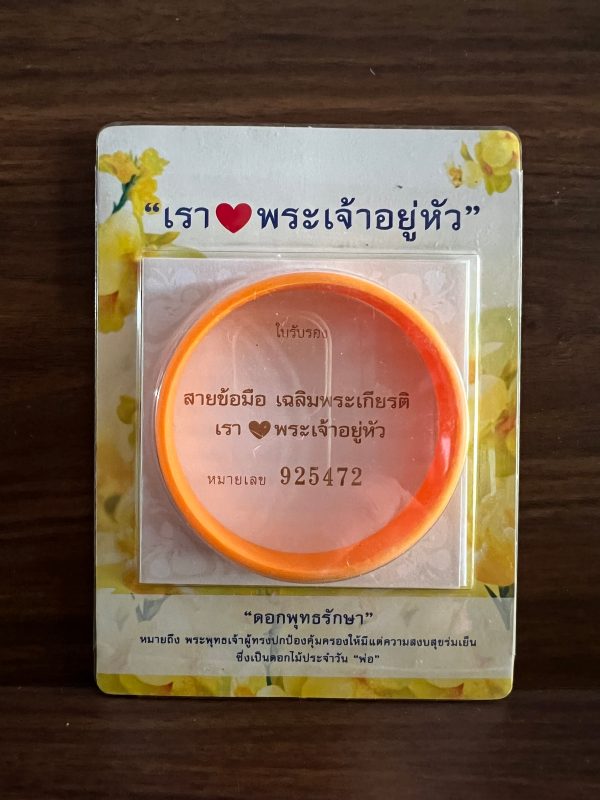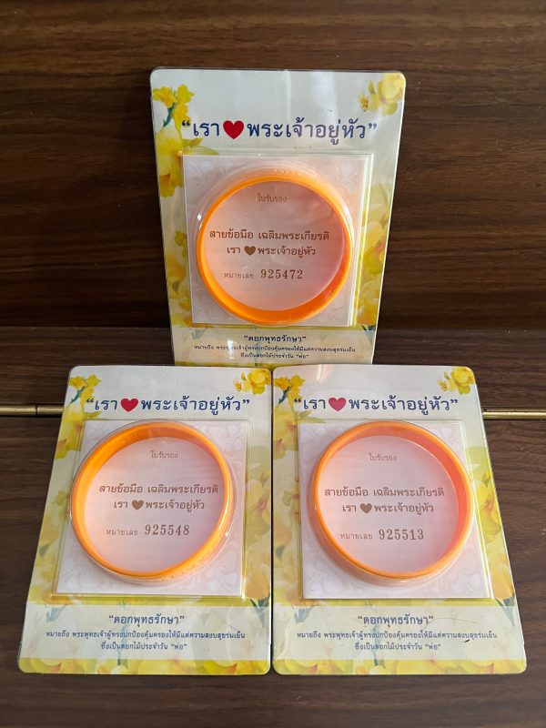 สายข้อมือเฉลิมพระเกียรติ์ “เรารักในหลวง” มีหมายเลชกำกับทุกเส้นบรรจุอยู่ในซองอย่างดี