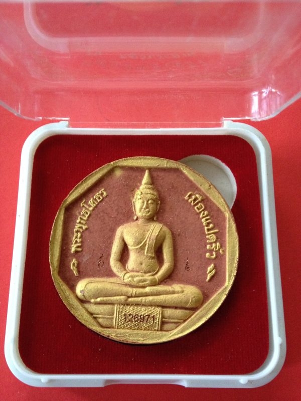 หลวงพ่อโสธรรุ่น ” ทองประธาน ” องค์พระสีทองฉากแดง ข้างองค์พระตอกโค๊ต ส่วนที่ฐานตอกโค๊ต 126971 พร้อมกล่อง