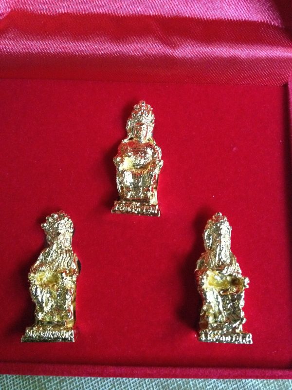 หล่อองค์เจ้าแม่ทับทิม,เจ้าพ่อกวนอูและเจ้าพ่อปึงเฒ่ากงอยู่ในกล่องกำมะยี่สีแดงสวยงาม (รุ่น 1 เปิดศาลมีแล้วรวย)