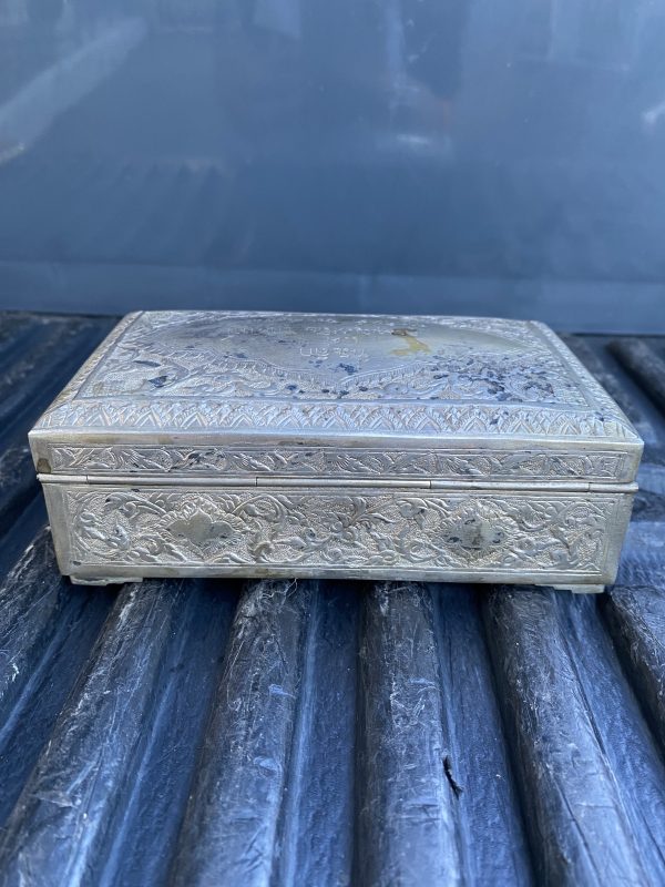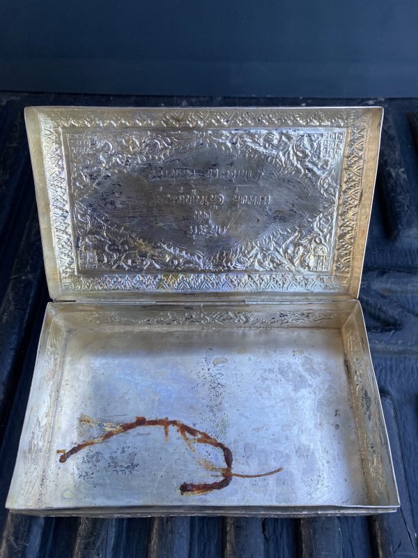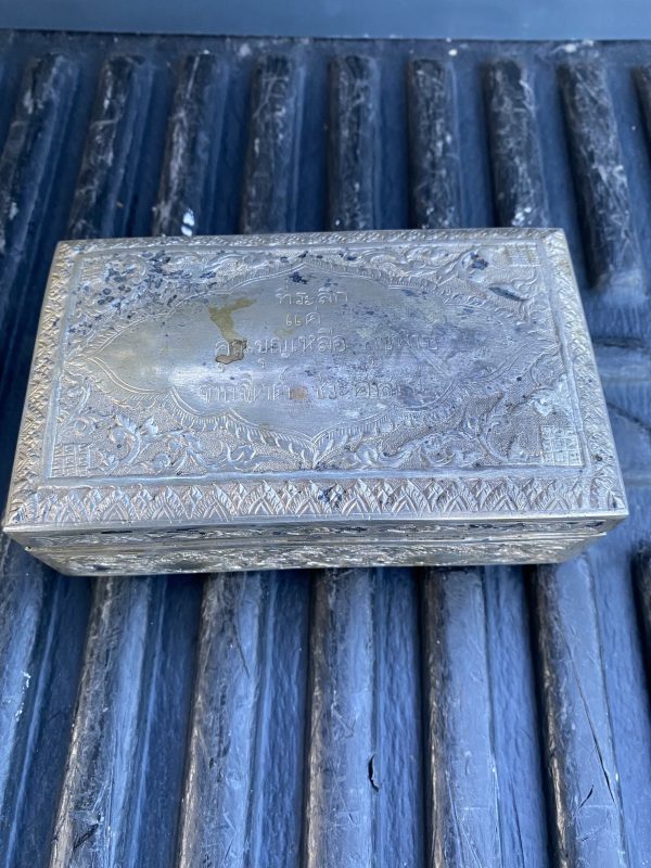 หีบเงินเก่า(โบราณ)หนัก 29.04 กรัม ( 1.9 บาท ) แกะลวดลายโบราณมีฝาปิดสลัก ที่ระลึกแด่ คุณบุญเหลือ สุขพงษ์ จากคุณ จิตต์ ชีวะศาสธน์ สมบูรณ์สวยงามมาก