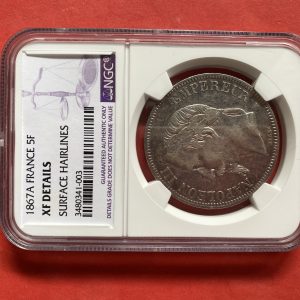 เหรียญเก่าเนื้อเงินประเทศ FRANCE สมัย NAPOLEON III ปี1867 มูลค่า 5 Fance ส่งคัดเกรด ตรงกับปลายสมัย ร.4 พ.ศ.2409