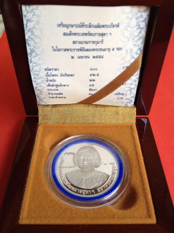 เหรียญกษาปณ์ที่ระลึกสมเด็จพระเทพรัตนราชสุดา ฉลองพระชนมายุ 5 รอบ 2 เม.ย.2558 เนื้อเงินขัดเงา หนัก 22 g พร้อมกล่องและใบ