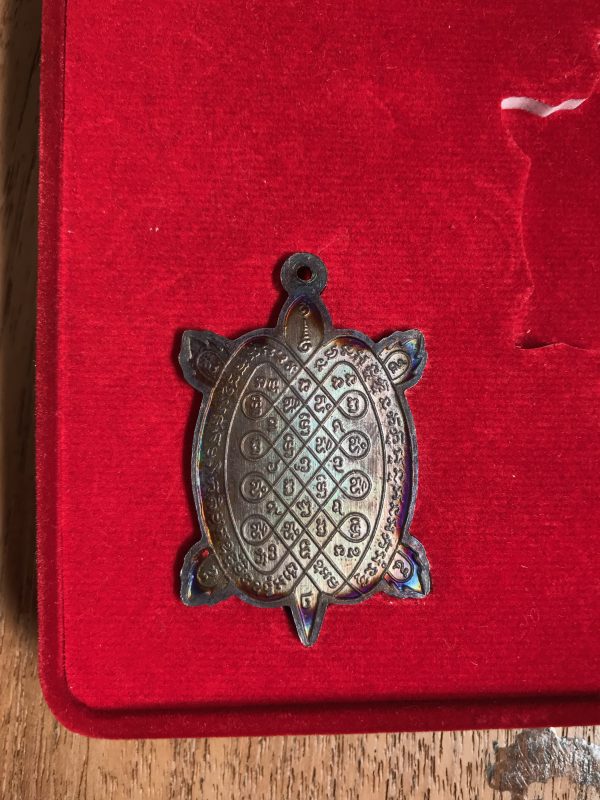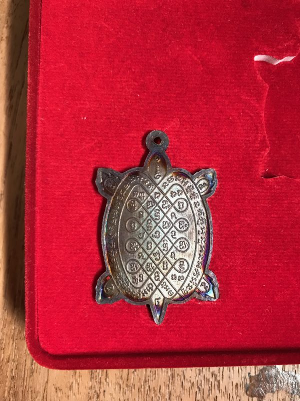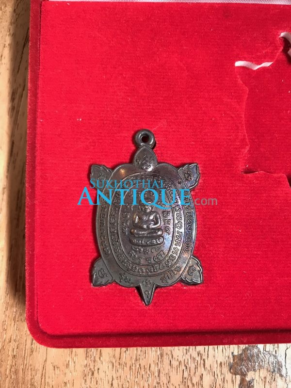 เหรียญพญาเต่าเรือน หลวงพ่อหลิว วัดไร่แตงทอง นครปฐม ปี 2537 ” รุ่น สุขใจ ” เนื้อ นวะโลหะผิวไฟ ตอก 2 โค๊ตมีบอลกล่องเดิม