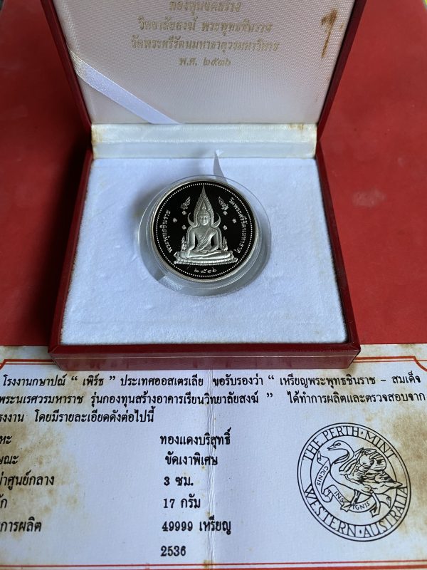 เหรียญสมเด็จพระนเรศวรมหาราชหลังพระพุทธชินราช ปี 2536 เนื้อเงินขัดเงา จากโรงกษาปณ์ " เพิร์ธ "ออสเตรเลีย สวยเดิมพร้อมกล่อง