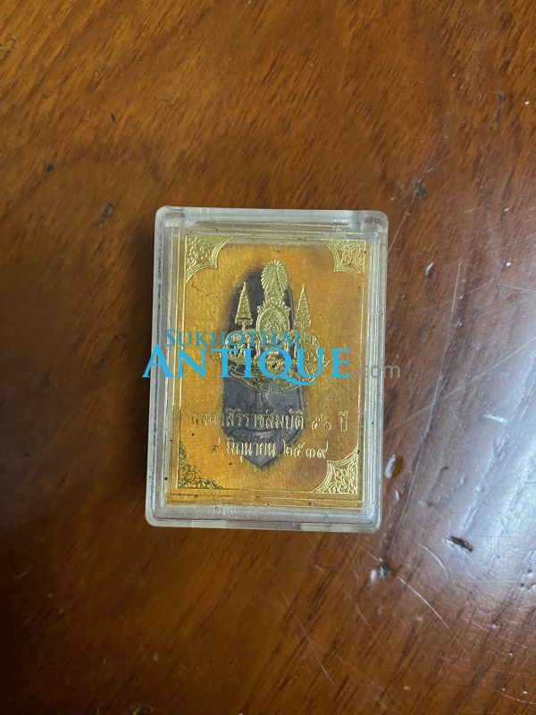 พระกำลังแผ่นดิน มวลสารจิตรดาออกวัดบวรรุ่นแรกปี 2539 ผ่านพิธีพุทธาภิเษก ด้านหลังมีตรากาญจนาภิเษก