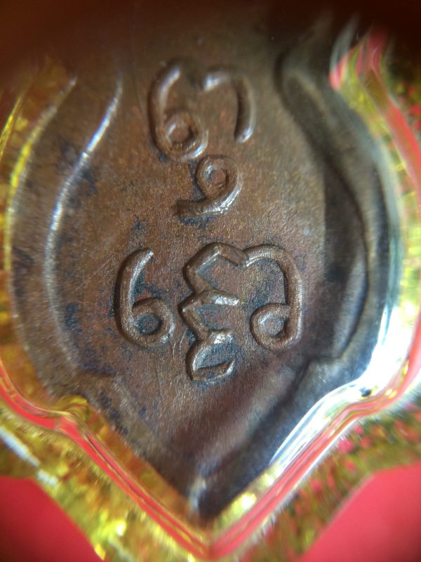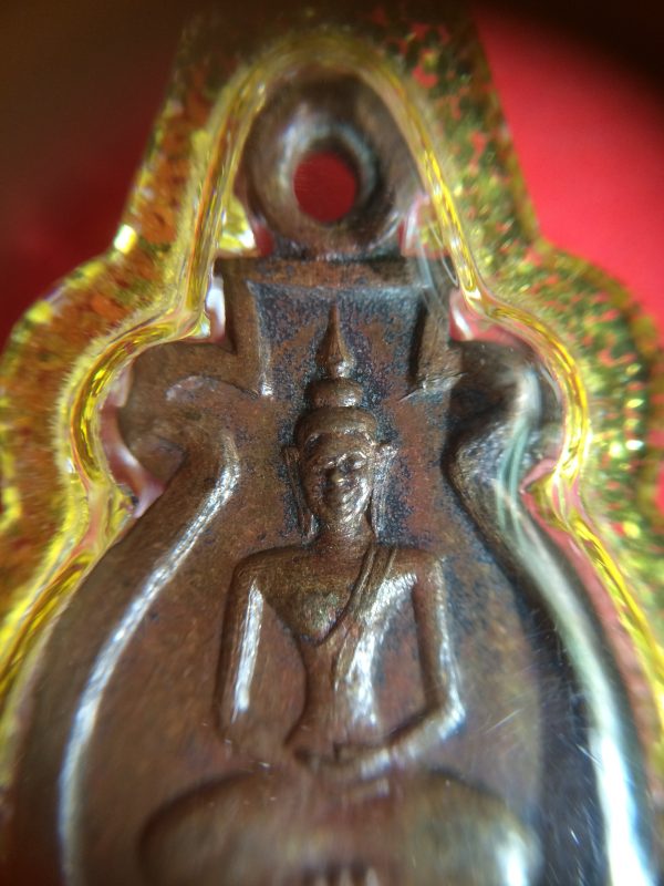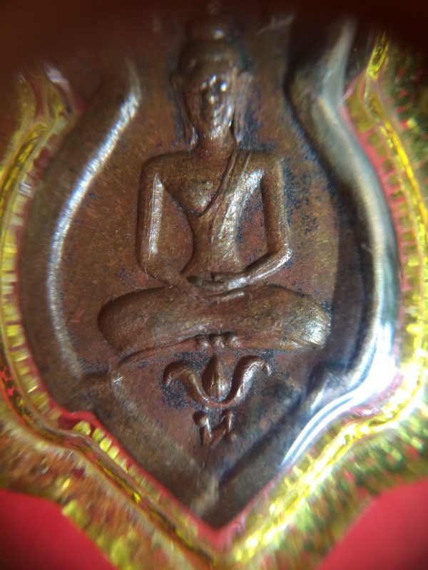 เหรียญพระพุทธเนื้อทองแดงพิมพ์ก้นแมงดา วัดไร่ขิง เลี่ยมพลาสติกใสขอบเหลืองเก่า