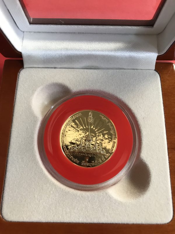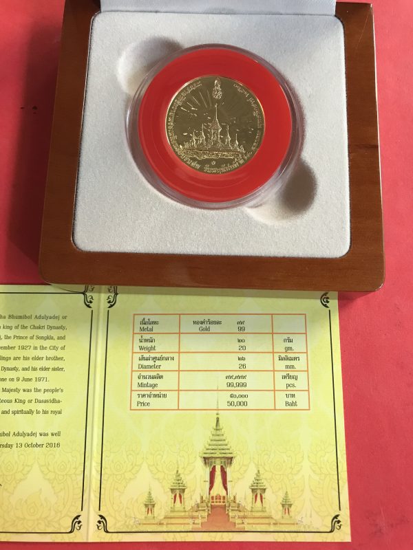 เหรียญพระราชพิธีถวายพระเพลิงพระบรมศพ เนื้อทองคำ 99% นำ้หนัก 20 กรัม เส้นผ่าศูนย์กลาง 26 มม. พฤหัสบดี ที่ 13 ต.ค.60