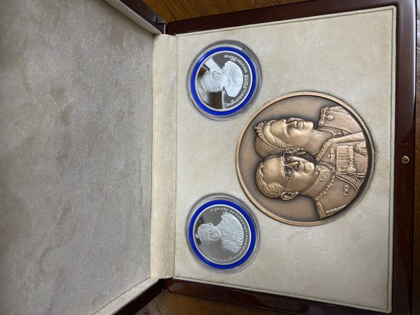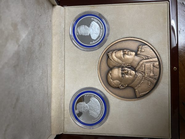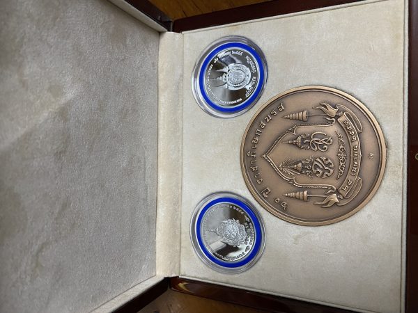 รวม 3 เหรียญบรรจุอยู่ในกล่องกำมะหยี่อย่างดี (ทองแดง7ซม.เนื้อเงิน 3.5ซม.)