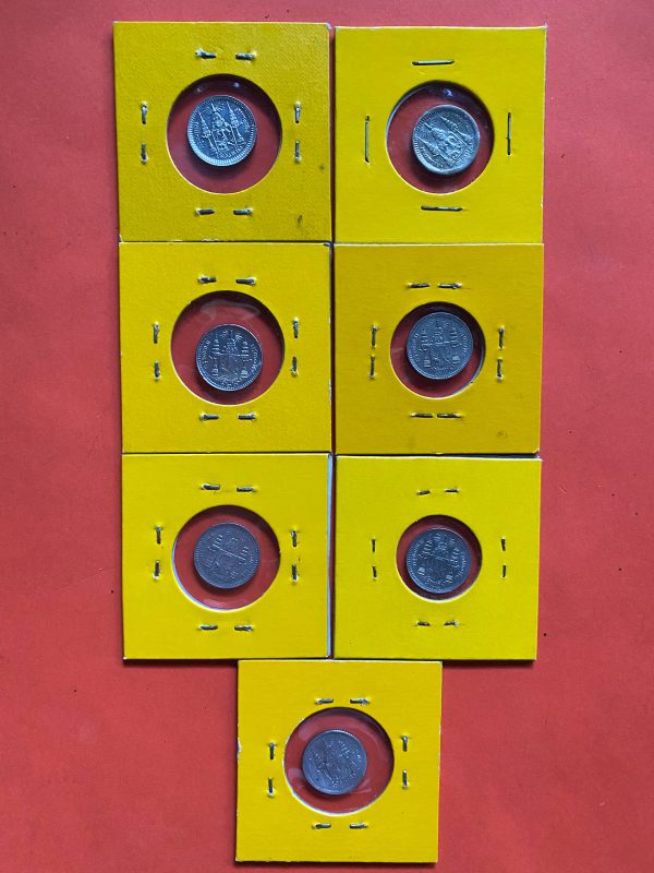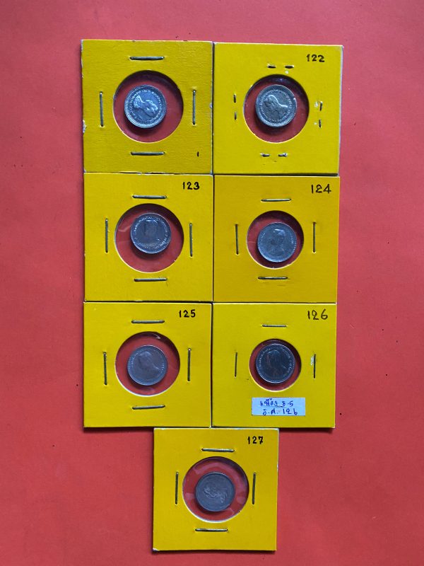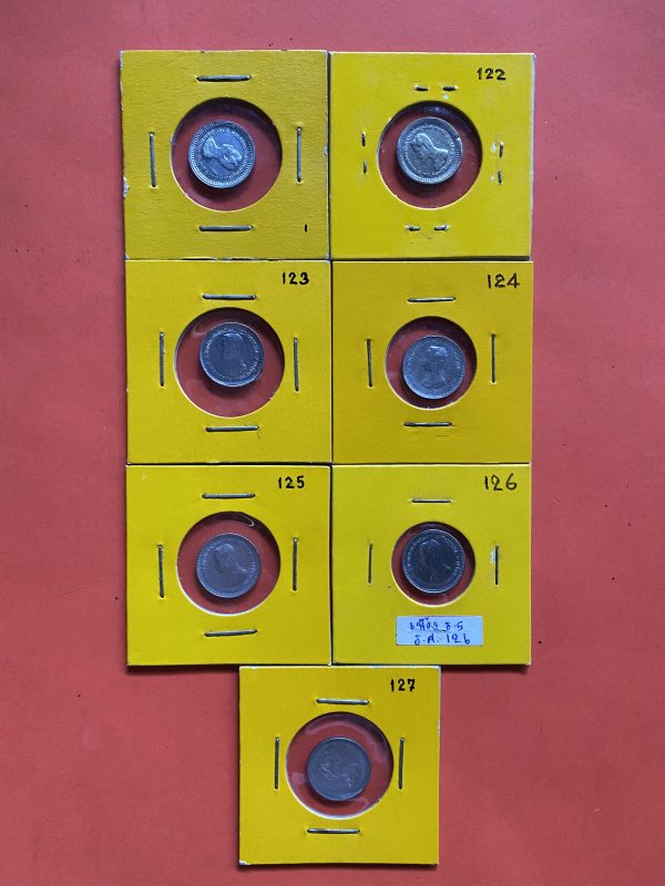 เหรียญหนึ่งเฟื้องสมัยร.5 เนื้อเงินผิวสวยทุกเหรียญจำนวน7เหรียญ ปี ค.ศ. 122,123,124,125,126,127และไม่มีร.ศ.