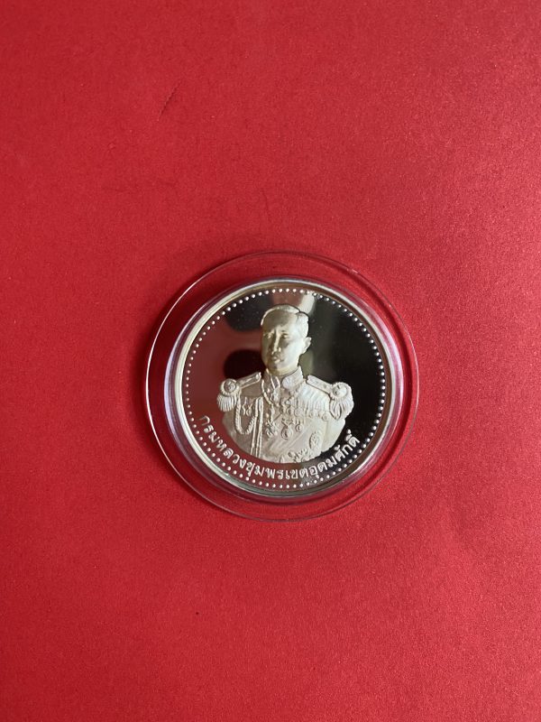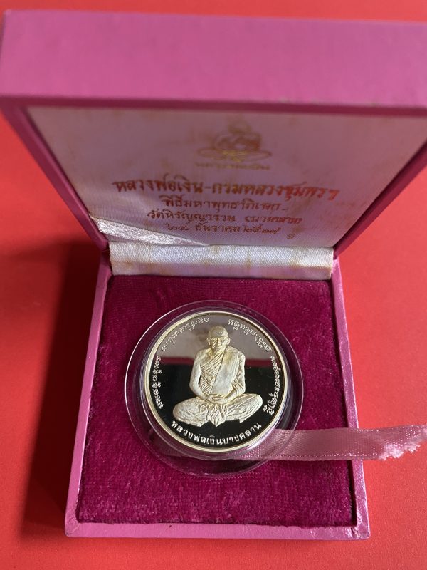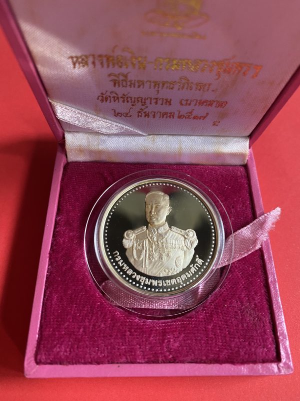 เหรียญหลวงพ่อเงินบางคลาน หลังกรมหลวงชุมพรฯ เนื้อเงินบริสุทธิ์ขัดเงาออกวันที่ 28 ธันวาคม ปี 2537 กล่องกำมะหยี่สีชมพูเดิม